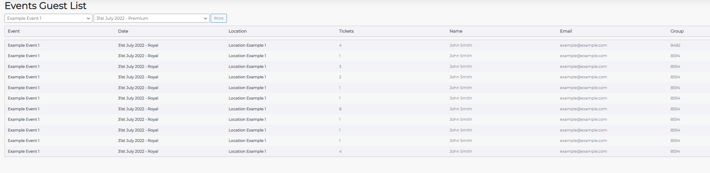 To view a guest list simply select the event and date. All ticket types and timeslots will be displayed.