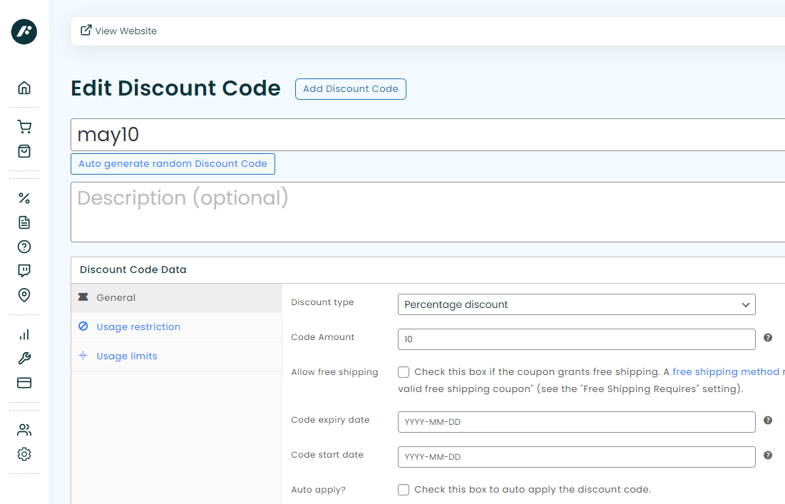 If you want to create a random discount code you can simply click on the ‘Auto generate random Discount Code’ button. Otherwise enter the code you wish to use, as in this example ‘may10’.