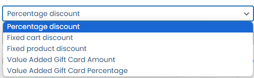 When this type is selected the code amount becomes the percentage. e.g. for 10% discount simply enter 10 as the amount.
